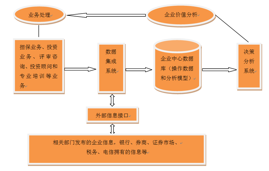 企業(yè)數(shù)據(jù)庫(kù)以企業(yè)中心數(shù)據(jù)庫(kù)為核心,還包括數(shù)據(jù)集成系統(tǒng)與決策分析系統(tǒng)。因此,企業(yè)數(shù)據(jù)庫(kù)的實(shí)施主要體現(xiàn)在企業(yè)業(yè)務(wù)和外部信息處理、企業(yè)數(shù)據(jù)集成系統(tǒng)、數(shù)據(jù)倉(cāng)庫(kù)和決策分析系統(tǒng)四大部分。正如圖8-2所示,建立企業(yè)數(shù)據(jù)庫(kù)的目的最終體現(xiàn)在進(jìn)行企業(yè)價(jià)值分析,以便更有效地開(kāi)展業(yè)務(wù)上。