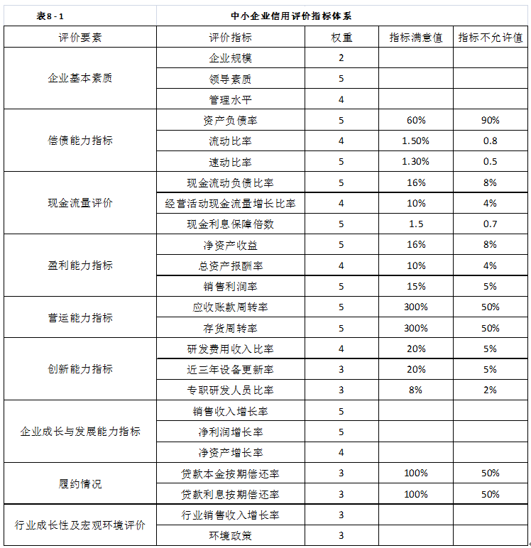 倉(cāng)儲(chǔ)金融業(yè)務(wù)中,中小企業(yè)篩選的標(biāo)準(zhǔn)要根據(jù)國(guó)家對(duì)于中小型企業(yè)發(fā)展的指導(dǎo)思想,即“選擇重點(diǎn),規(guī)范操作,總結(jié)經(jīng)驗(yàn),翁不推進(jìn)”與“支持發(fā)展與防范風(fēng)險(xiǎn)相結(jié)合;政府扶持與市場(chǎng)操作相結(jié)合;開(kāi)展擔(dān)保與提高信用相結(jié)合”的三個(gè)原則要求,結(jié)合企業(yè)的實(shí)際情況對(duì)中小型企業(yè)進(jìn)行篩選。倉(cāng)儲(chǔ)金融業(yè)務(wù)是一項(xiàng)新業(yè)務(wù),為有效規(guī)避風(fēng)險(xiǎn),銀行對(duì)企業(yè)的審查相對(duì)嚴(yán)格,獲得批準(zhǔn)者一般都是各項(xiàng)業(yè)務(wù)素質(zhì)比較優(yōu)良的企業(yè)。比如廣東發(fā)展銀行在審貨時(shí),一般選取行業(yè)市場(chǎng)占有率位于前三位的企業(yè),而且產(chǎn)品暢銷、價(jià)格穩(wěn)定、流通性好,同時(shí)也考慮企業(yè)的財(cái)務(wù)狀況、實(shí)力、品牌知名度等,目的是控制好信貸風(fēng)險(xiǎn)。與傳統(tǒng)信貸業(yè)務(wù)的審查不同,倉(cāng)儲(chǔ)金融業(yè)務(wù)對(duì)所服務(wù)的周末和小型企業(yè)的審核更強(qiáng)調(diào)企業(yè)的成長(zhǎng)性,這涉及該企業(yè)的還款來(lái)源。此外,經(jīng)營(yíng)管理團(tuán)隊(duì)、產(chǎn)品及其技術(shù)含量、市場(chǎng)等也是審查的重點(diǎn)。對(duì)中小型企業(yè)的信用評(píng)價(jià)指標(biāo)體系如表8-1所示,評(píng)價(jià)的要素包括企業(yè)基本要素、賠償能力指標(biāo)、現(xiàn)金流量評(píng)價(jià)、盈利能力指標(biāo)、營(yíng)運(yùn)能力指標(biāo)、創(chuàng)新能力指標(biāo)、企業(yè)成長(zhǎng)與發(fā)展能力指標(biāo)、履約情況、行業(yè)成長(zhǎng)性與宏觀環(huán)境評(píng)價(jià)。